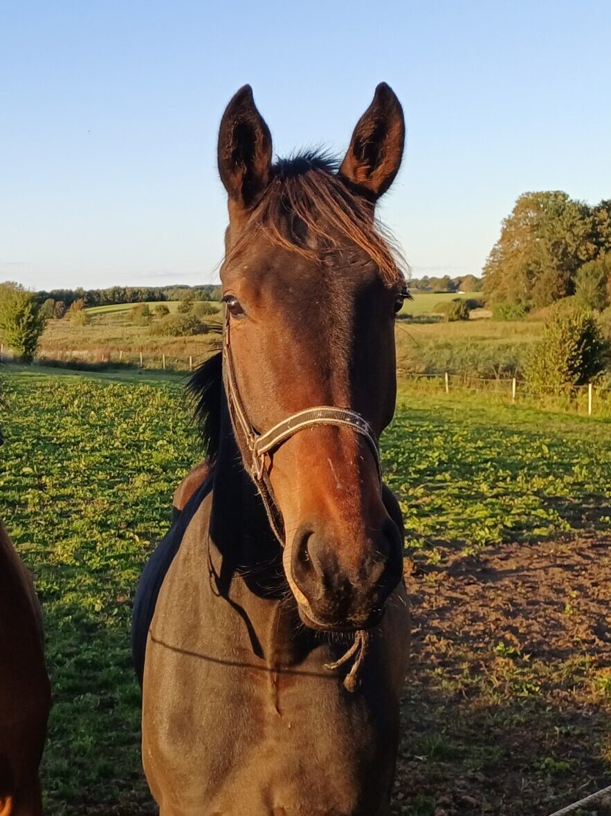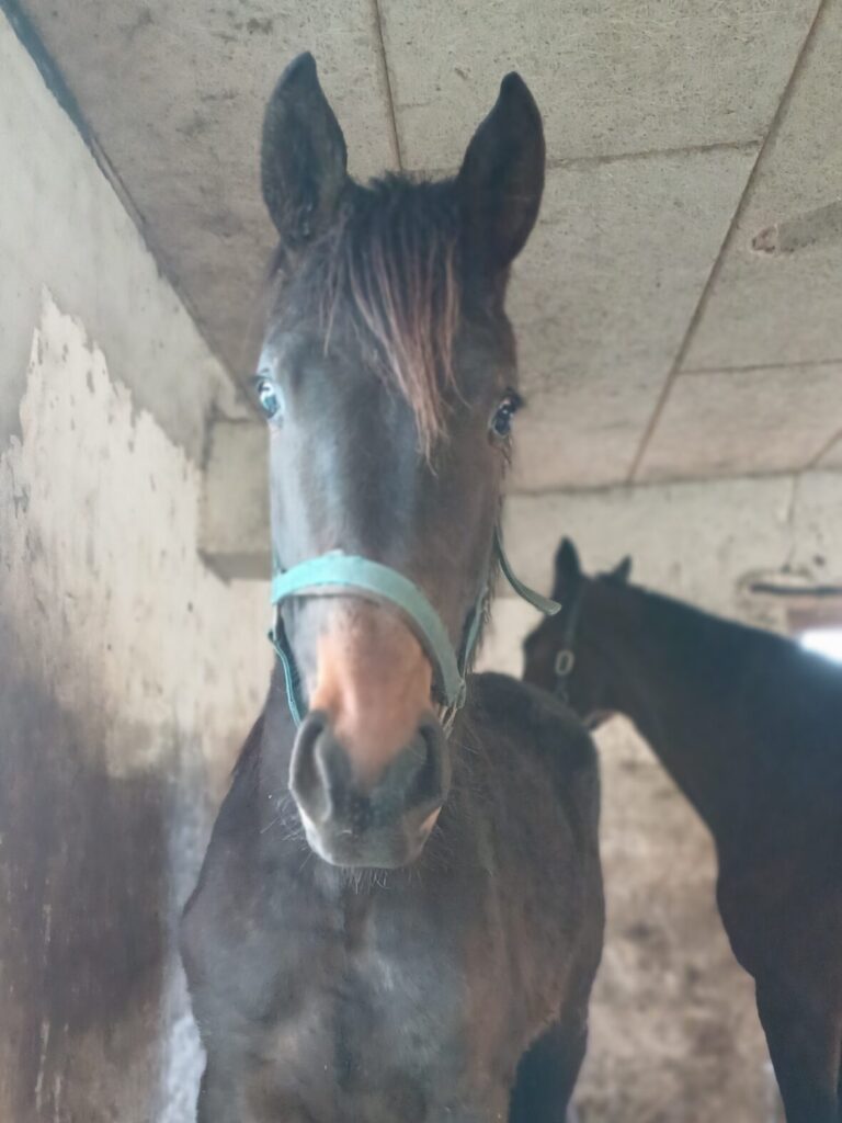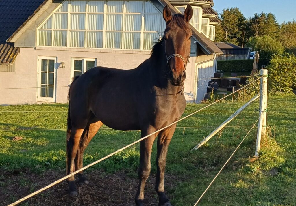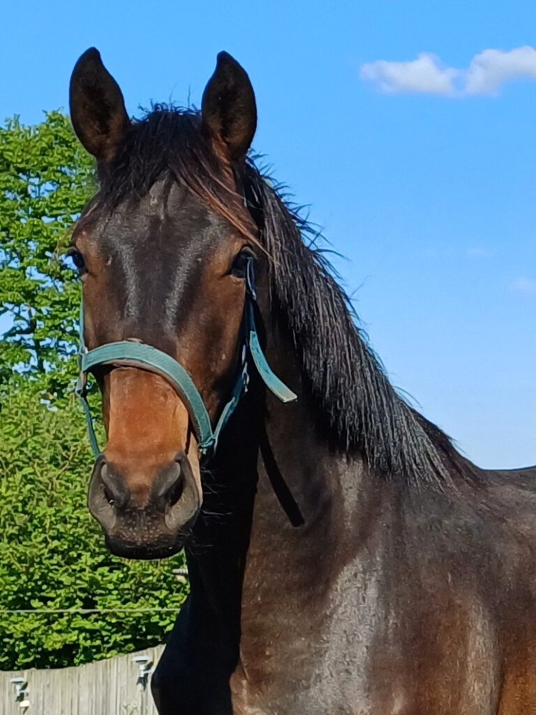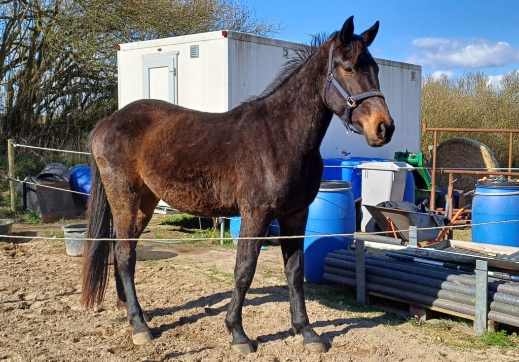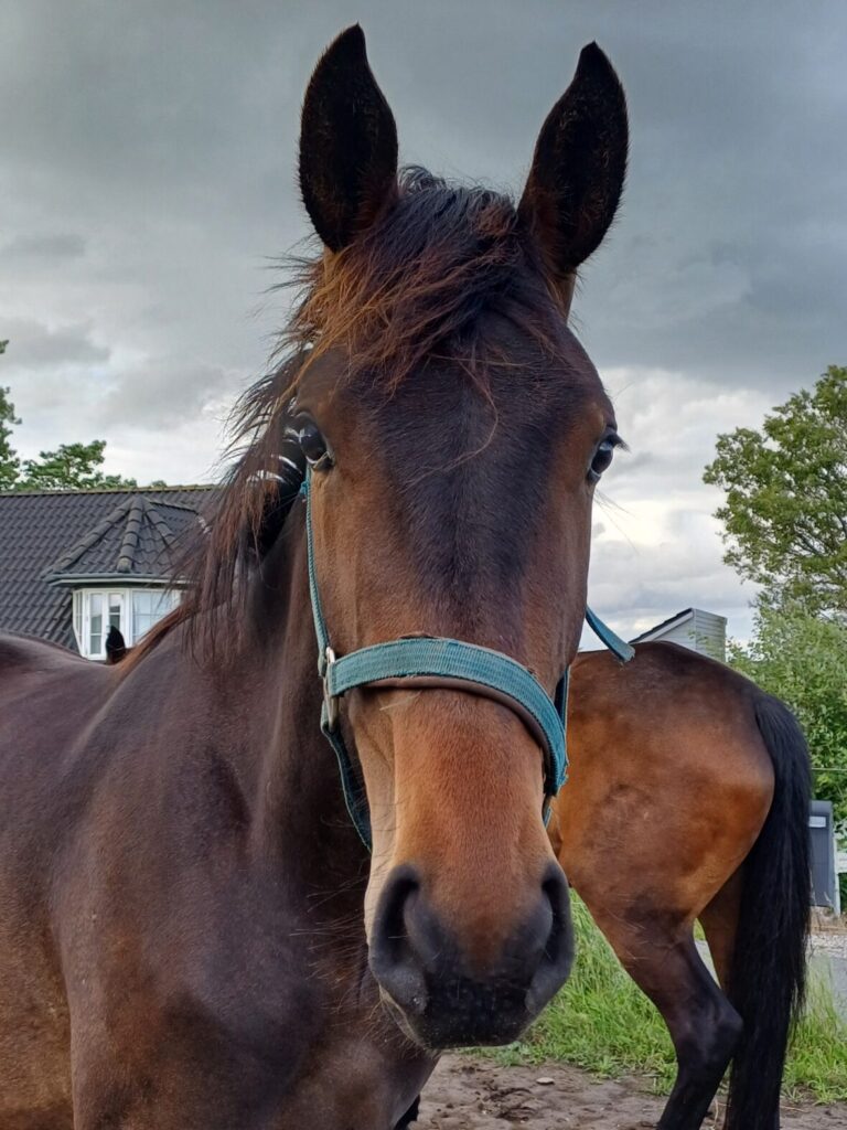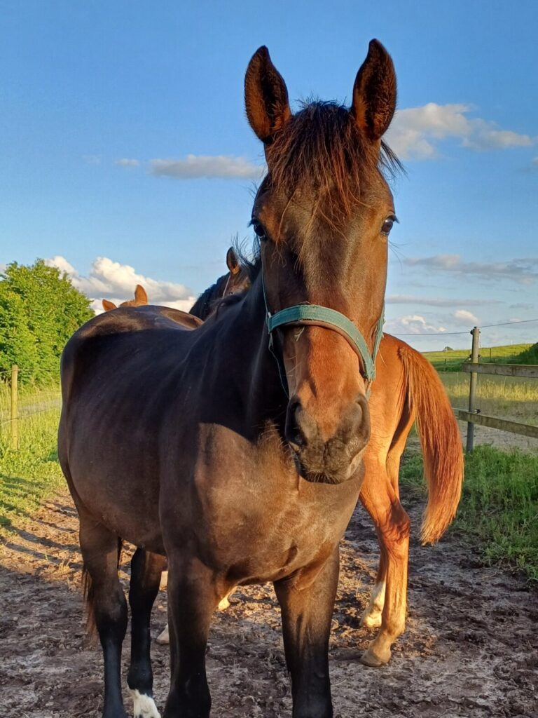 Han er vant til daglig håndtering og kan løfte alle fire ben uden problemer. Han står roligt bundet og tager nye oplevelser med nysgerrighed og ro.