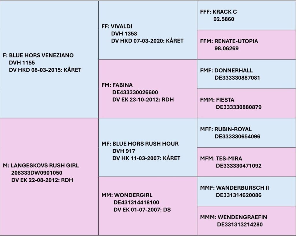 Langeskovs Vincent er efter den anerkendte Blue Hors Veneziano, der har sat sit præg på dansk og international dressur med sine elegante bevægelser og ridelighed. Hans morfar, Blue Hors Rush Hour, er kendt for at give afkom med kraftfuld galop, god takt og en stærk, harmonisk type. Denne kombination giver Vincent både naturlig balance, energi og et stort bevægelsespotentiale i alle tre gangarter.